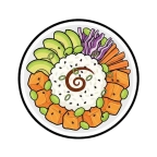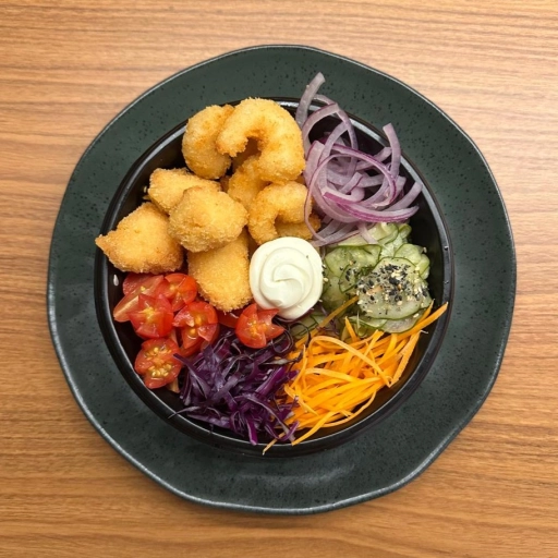 Arroz, camarão empanado, cebola roxa, repolho roxo, sunomono, cenoura, crispies de alho poró e cream cheese.