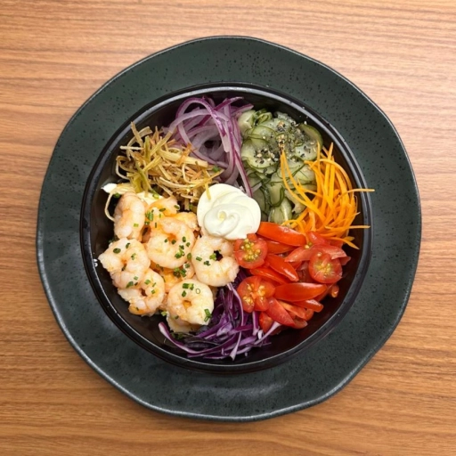 Arroz, camarão, cebolinha, cebola roxa, repolho roxo, sunomono, cenoura, crispies de alho poró e cream cheese.